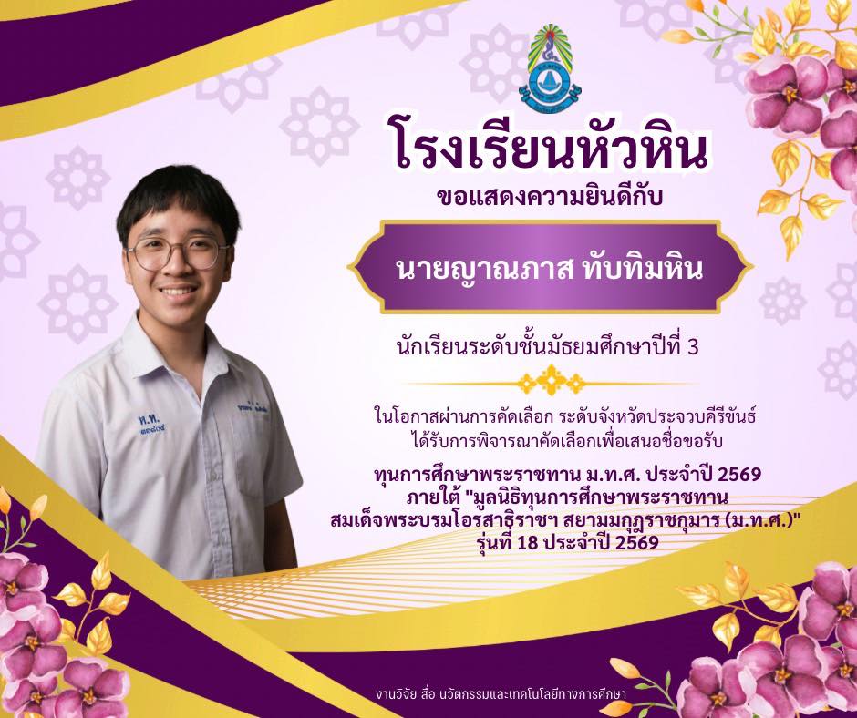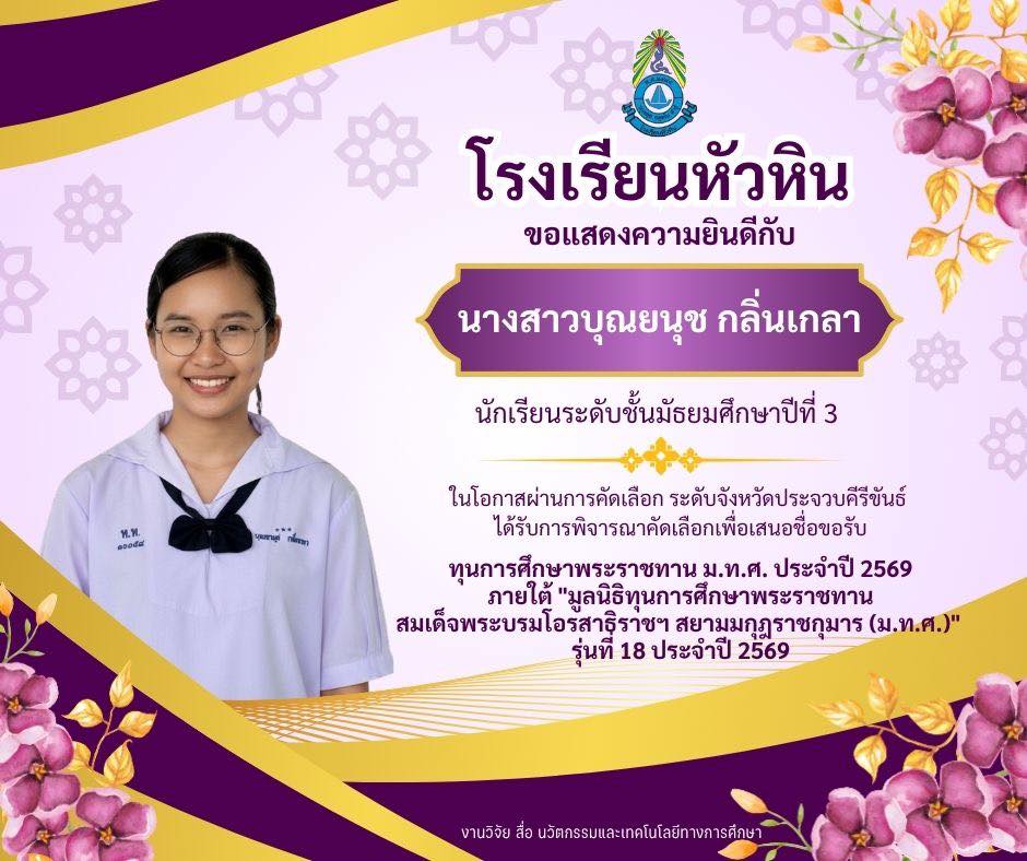 โรงเรียนหัวหินได้รับการคัดเลือกเป็นผลงานการขับเคลื่อนตรงตามข้อคิดเห็นคณะกรรมการสภานักเรียน ระดับประเทศ ประจำปี 2567 กิจกรรม “TSC The Best History” สืบสาน สร้างสรรค์ แบ่งปันอดีต